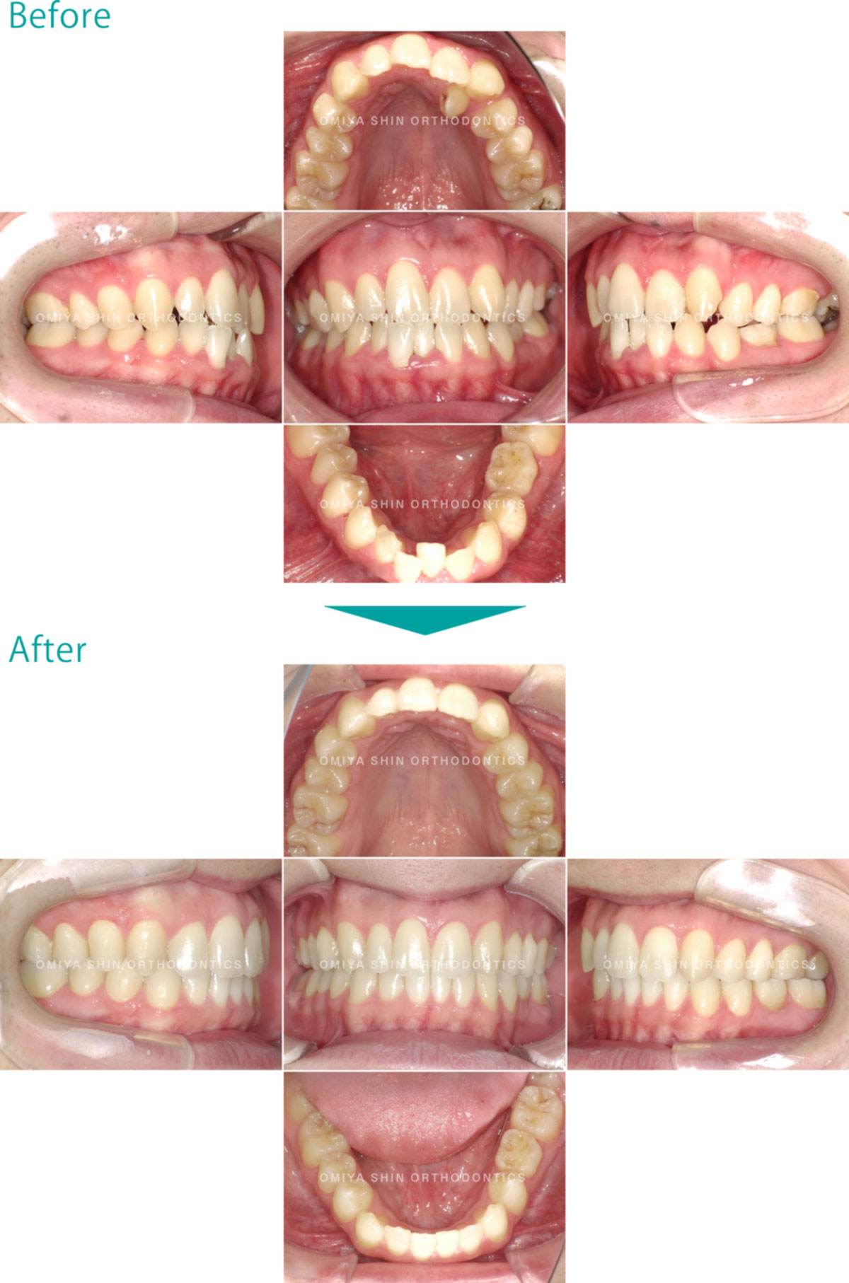 ガタガタなことを気にして来院された患者様です。抜歯(上顎左側側切歯)を行い、IPR(上下の歯をヤスリがけ)して、マウスピース型矯正装置(インビザライン)を使用し、ガタガタと咬み合わせを改善しました。