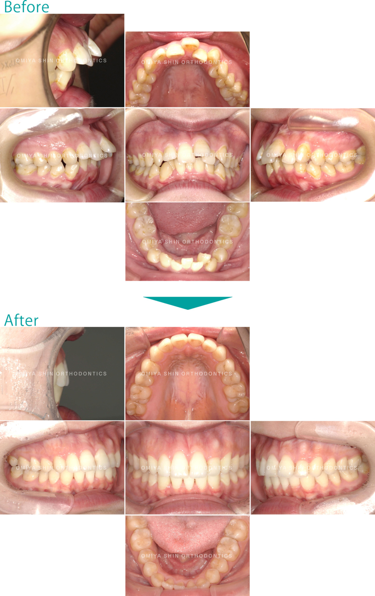出っ歯なことを気にして来院された患者さまです。抜歯(下顎右側中切歯)でIPR(上下の歯のやすりがけ)をして、マウスピース矯正装置(インビザライン)を使用し、ガタガタとかみ合わせを改善しました。