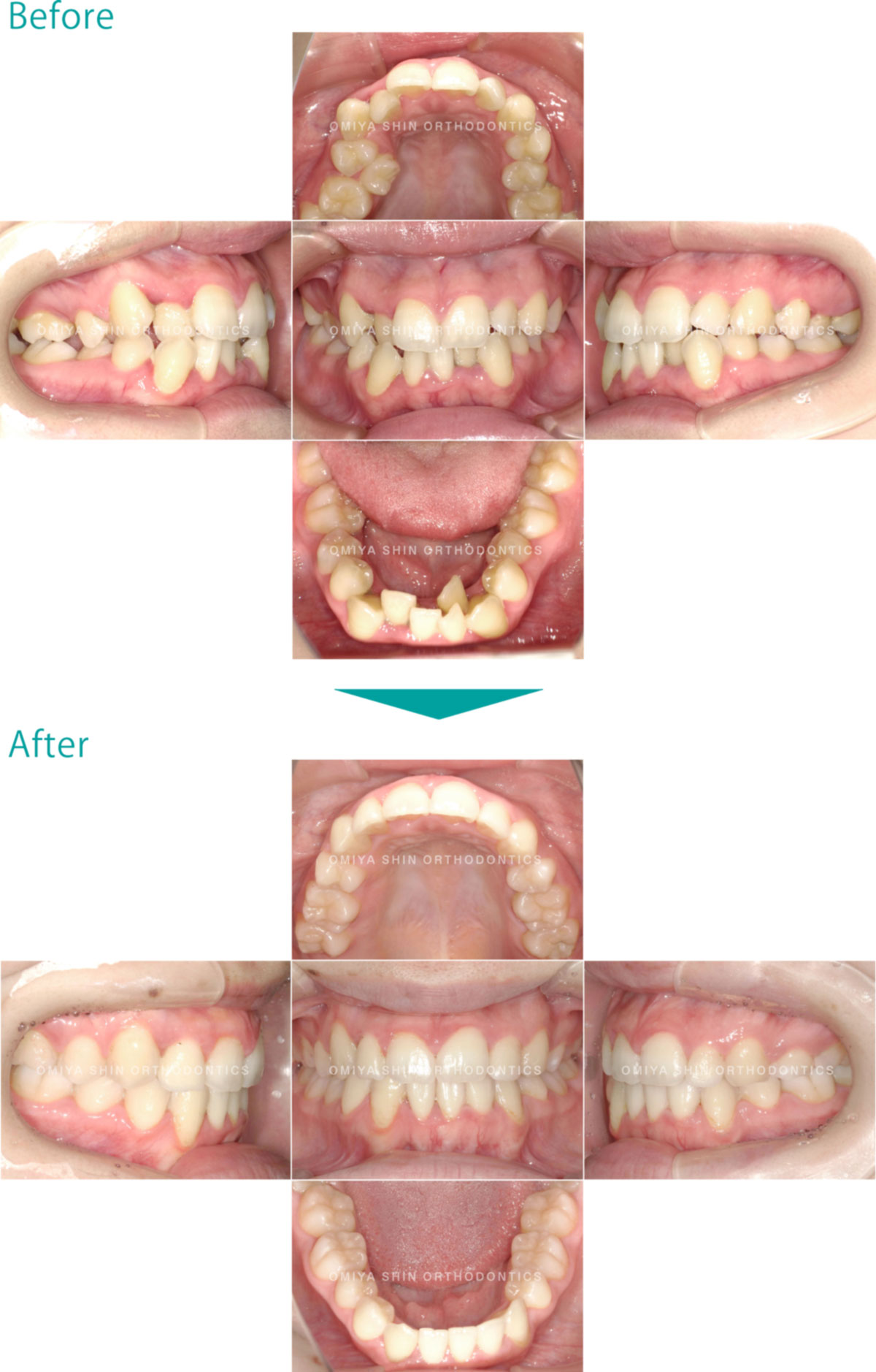 ガタガタなことを気にして来院された患者様です。抜歯(上顎右側第二小臼歯、上下左側第一小臼歯、下顎右側側切歯)を行い、IPR(上下の歯をヤスリがけ)して、マウスピース型矯正装置(インビザライン)を使用し、ガタガタと咬み合わせを改善しました。