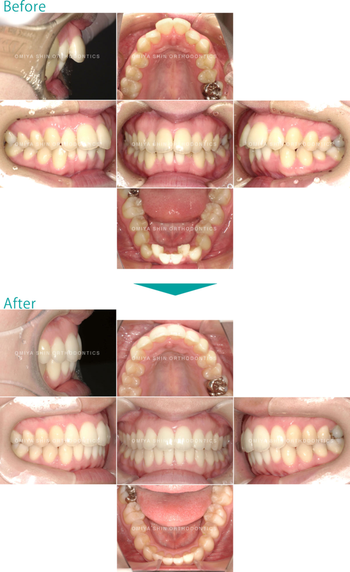 CASE 262 上顎前突(出っ歯) 22歳/女性/治療期間:2年8ヶ月 非抜歯 マウスピース矯正装置(インビザライン) 出っ歯なことを気にして来院された患者様です。非抜歯で、IPR(上下の歯をヤスリがけ)して、マウスピース型矯正装置(インビザライン)を使用し、咬み合わせを改善しました。 主訴:出っ歯 診断名:上顎前突 初診時年齢・性別:22歳・女性 治療装置:マウスピース型矯正装置(インビザライン) 抜歯or非抜歯:非抜歯 治療期間:2年8ヶ月 リスクと副作用:痛み、歯根吸収、歯肉退縮、虫歯、後戻り 費用:92万円程度(税別) 詳細はこちらをご覧ください 症例一覧へ