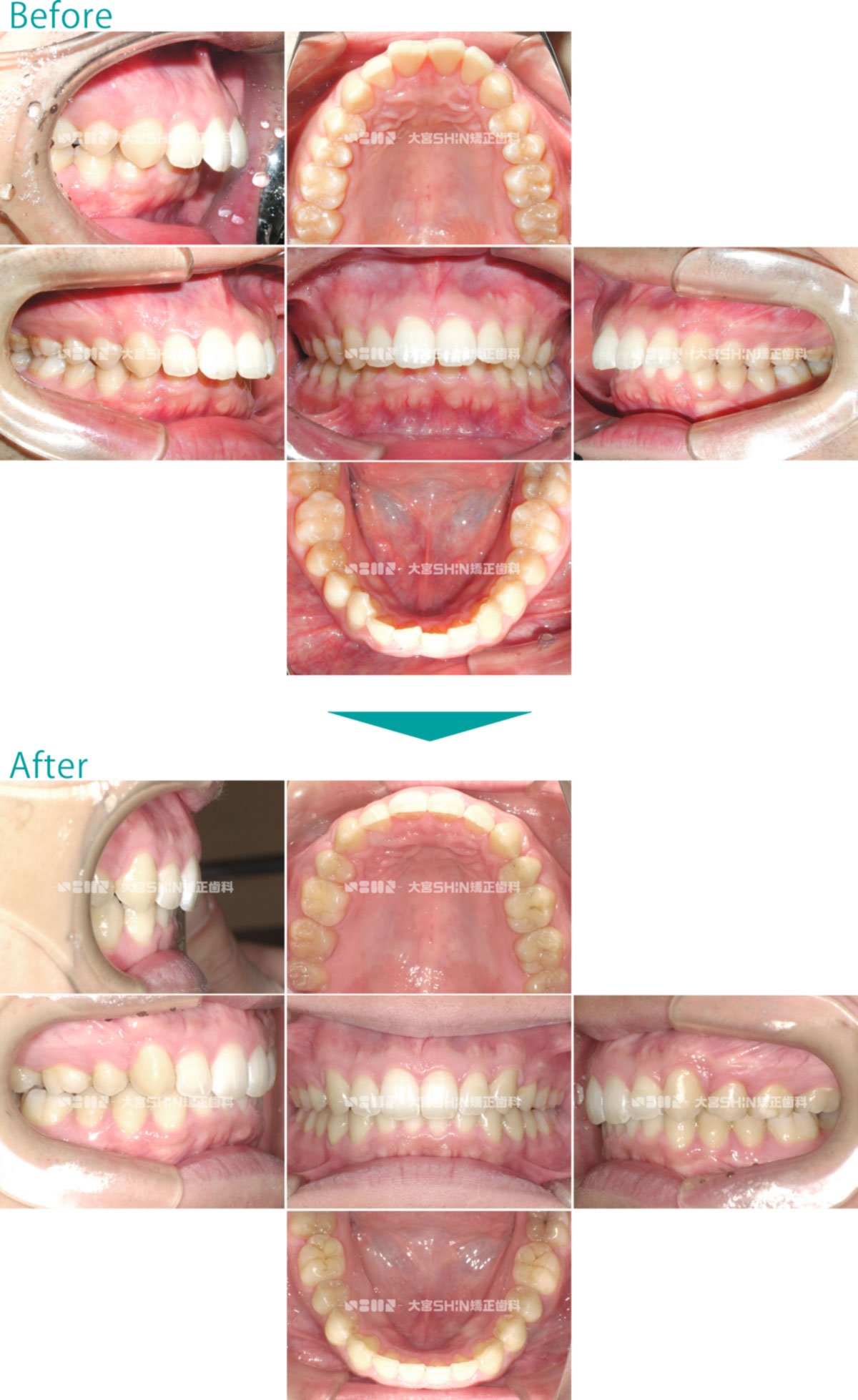 上顎前突(出っ歯)、過蓋咬合(咬み合わせが深い) 26歳/男性/治療期間:4年1ヶ月 抜歯 裏側矯正 出っ歯なことを気にして来院された患者様です。抜歯(上顎左右第一小臼歯)をして、裏側矯正(ワイヤー)を使用し、出っ歯と咬み合わせを改善しました。 主訴:出っ歯 診断名:上顎前突・過蓋咬合 初診時年齢・性別:26歳・男性 治療装置:裏側矯正(ワイヤー) 抜歯or非抜歯:抜歯(上顎左右第一小臼歯) 治療期間:4年1ヶ月 リスクと副作用:痛み、歯根吸収、歯肉退縮、虫歯、後戻り 費用:130万円程度(税別) 詳細はこちらをご覧ください 症例一覧へ