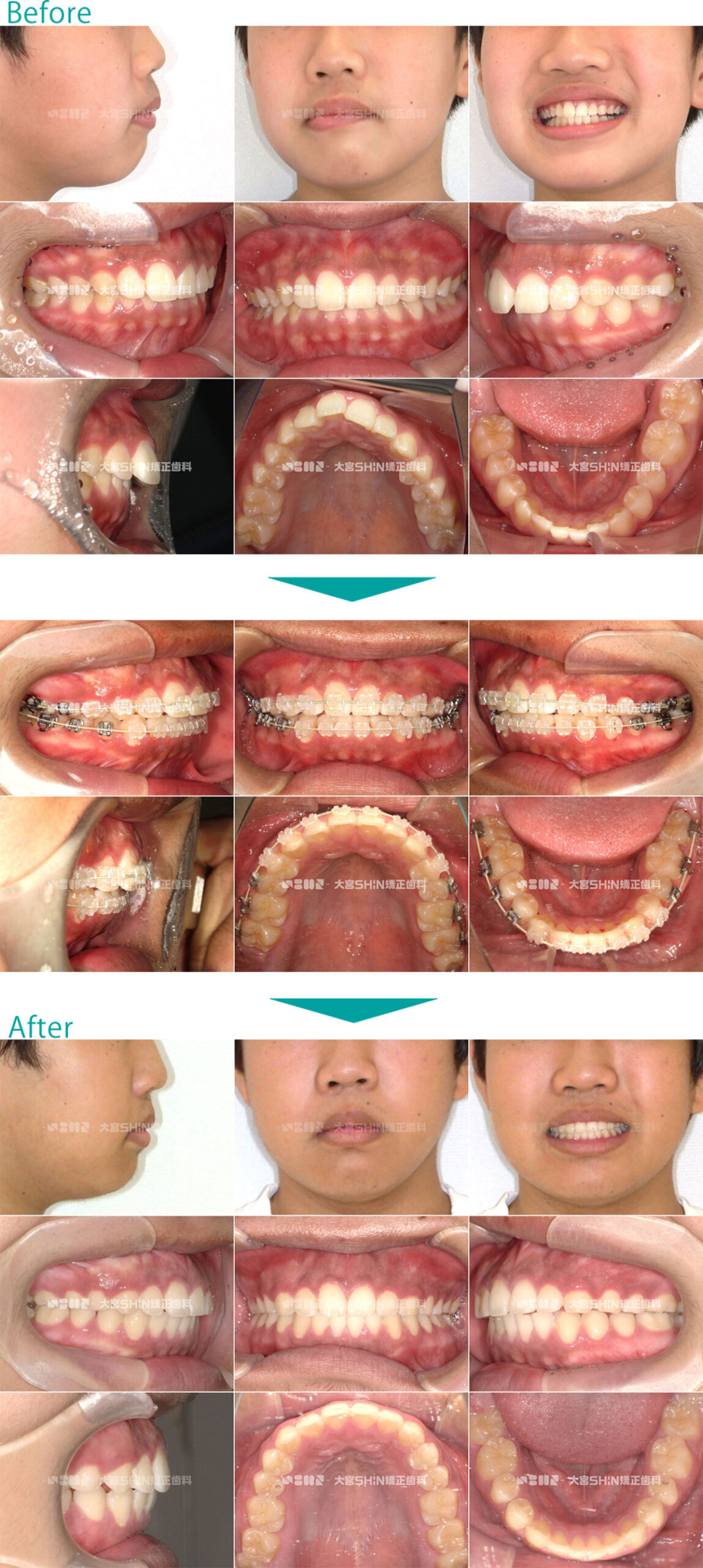 上顎前突(出っ歯)、過蓋咬合(咬み合わせが深い) 12歳/男の子/治療期間:3年4ヶ月 非抜歯 表側矯正 出っ歯を気にして来院された患者様です。非抜歯で、表側矯正(ワイヤー)を使用し、咬み合わせを改善しました。 主訴:出っ歯が気になる 診断名:上顎前突、過蓋咬合 初診時年齢・性別:12歳・男性 治療装置:表側矯正(ワイヤー) 抜歯or非抜歯:非抜歯 治療期間:3年4ヶ月 リスクと副作用:痛み、歯根吸収、歯肉退縮、虫歯、後戻り 費用:79万5千円程度(税別) 詳細はこちらをご覧ください 症例一覧へ