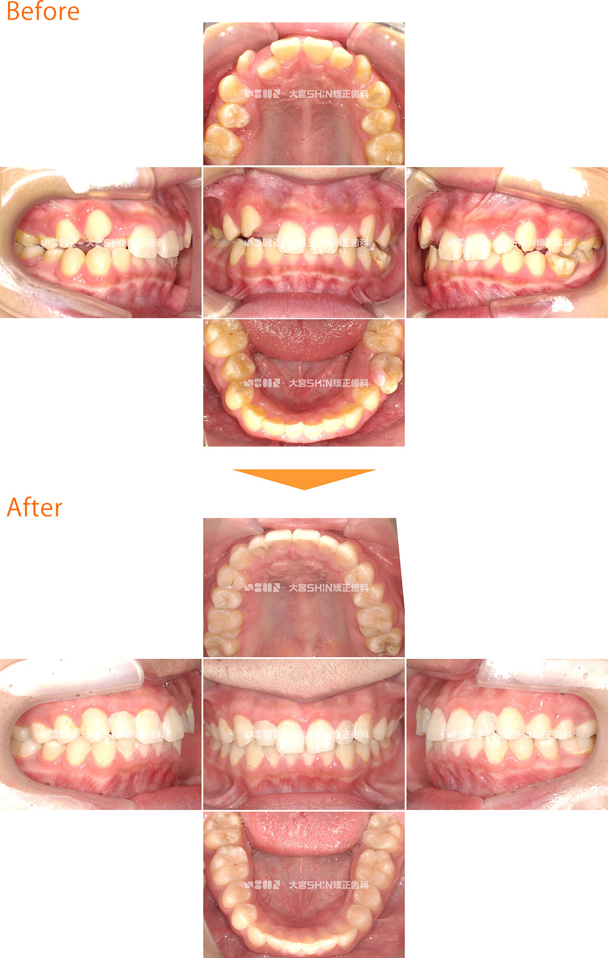 叢生(ガタガタ) 11歳/男の子/治療期間:3年 非抜歯 マウスピース矯正装置(インビザライン) ガタガタなことを気にして来院された患者様です。非抜歯で、IPR(上下の歯をヤスリがけ)して、マウスピース型矯正装置(インビザライン)を使用し、ガタガタと咬み合わせを改善しました。 主訴:ガタガタが気になる 診断名:叢生 初診時年齢・性別:11歳・男性 治療装置:マウスピース型矯正装置(インビザライン) 抜歯or非抜歯:非抜歯 治療期間:3年 リスクと副作用:痛み、歯根吸収、歯肉退縮、虫歯、後戻り 費用:83万円程度(税別) 詳細はこちらをご覧ください 症例一覧へ