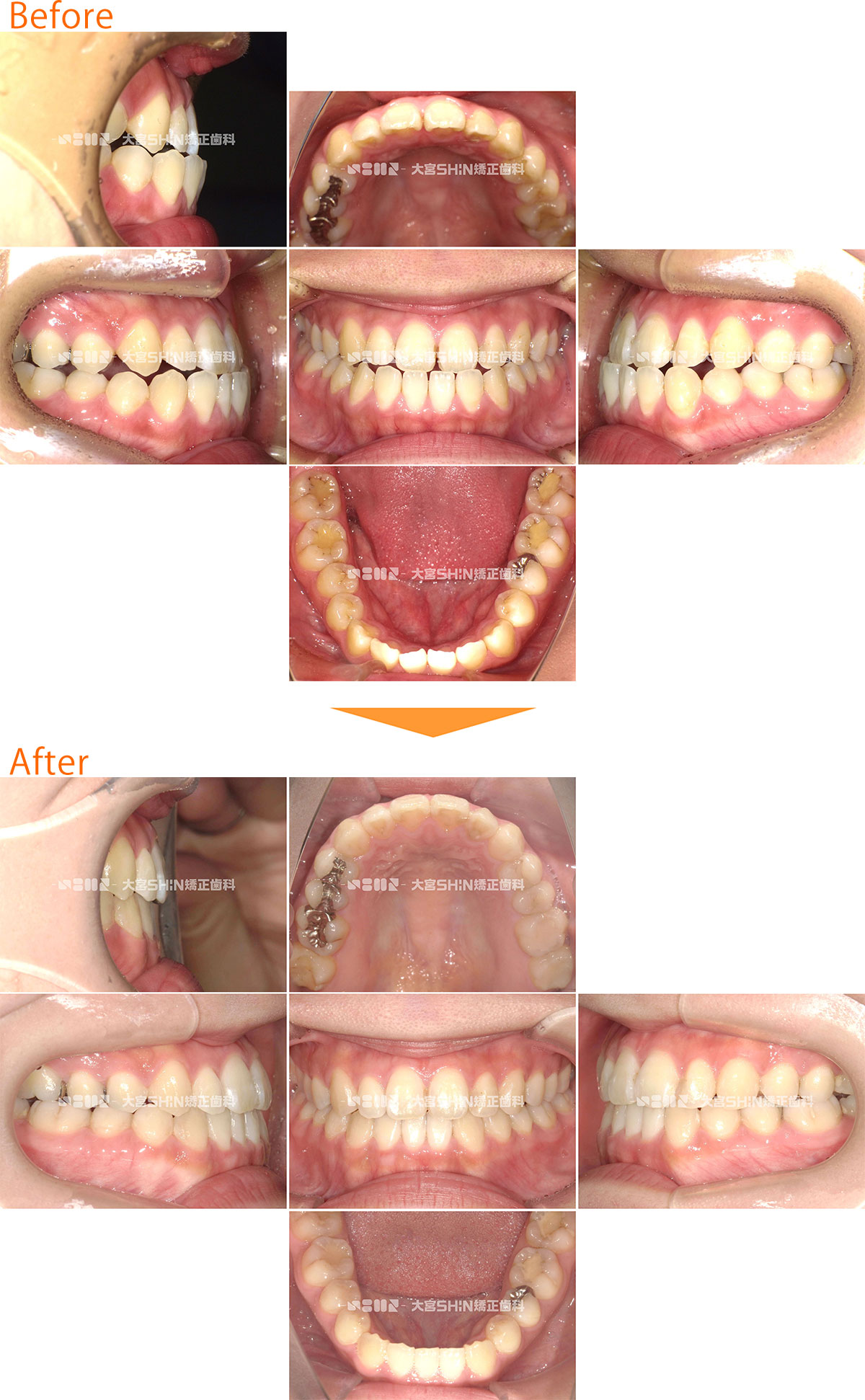 咬み合わせが反対なことを気にして来院された患者様です。非抜歯で、プレオルソを使用し、咬み合わせを改善した後、表側矯正(ワイヤー)でガタガタを改善しました。