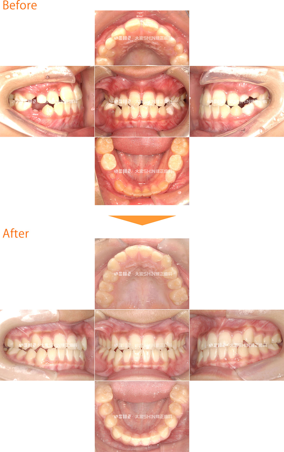 前歯のすき間を気にして来院された患者様です。非抜歯で、取り外し式矯正装置拡大床)を使用し、永久歯が生えるスペースを確保した後、表側矯正ワイヤー)でガタガタ前歯のすき間を改善しました。
