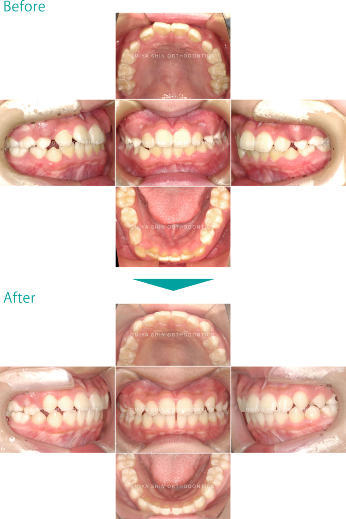 ガタガタなことを気にして来院された患者様です。非抜歯で、取り外し式矯正装置(拡大床)を使用し、永久歯を並べるためのスペースを確保した後、ワイヤーを使用してガタガタを改善しました。