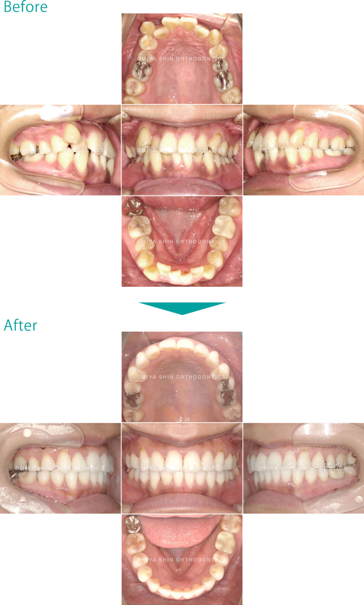 ガタガタをにして来院された患者様です。非抜歯で、取り外し式矯正装置(拡大床)を使用し、永久歯が生えるスペースを確保した後、表側矯正(ワイヤー)で、ガタガタを改善しました。