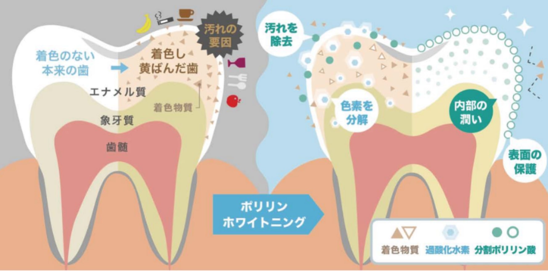ポリリンが歯の表面の汚れを浮かせて落とし、過酸化水素が歯の表面・内部の色素を分解。歯の内部に水分と共に過酸化水素が入り込み、潤いを与えながら歯を白く漂白します。